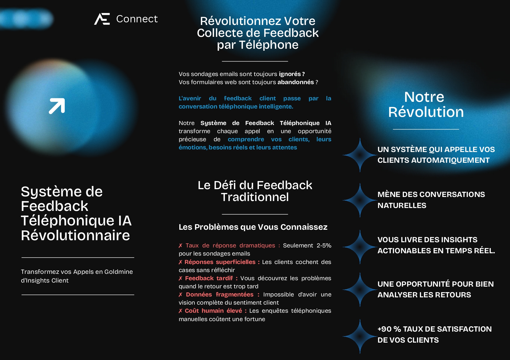 Ce projet consiste en le développement d'un agent intelligent qui automatise les appels téléphoniques et répond aux clients pour la collecte des retours. Le système utilise des technologies avancées d'intelligence artificielle pour créer une expérience conversationnelle naturelle et efficace.