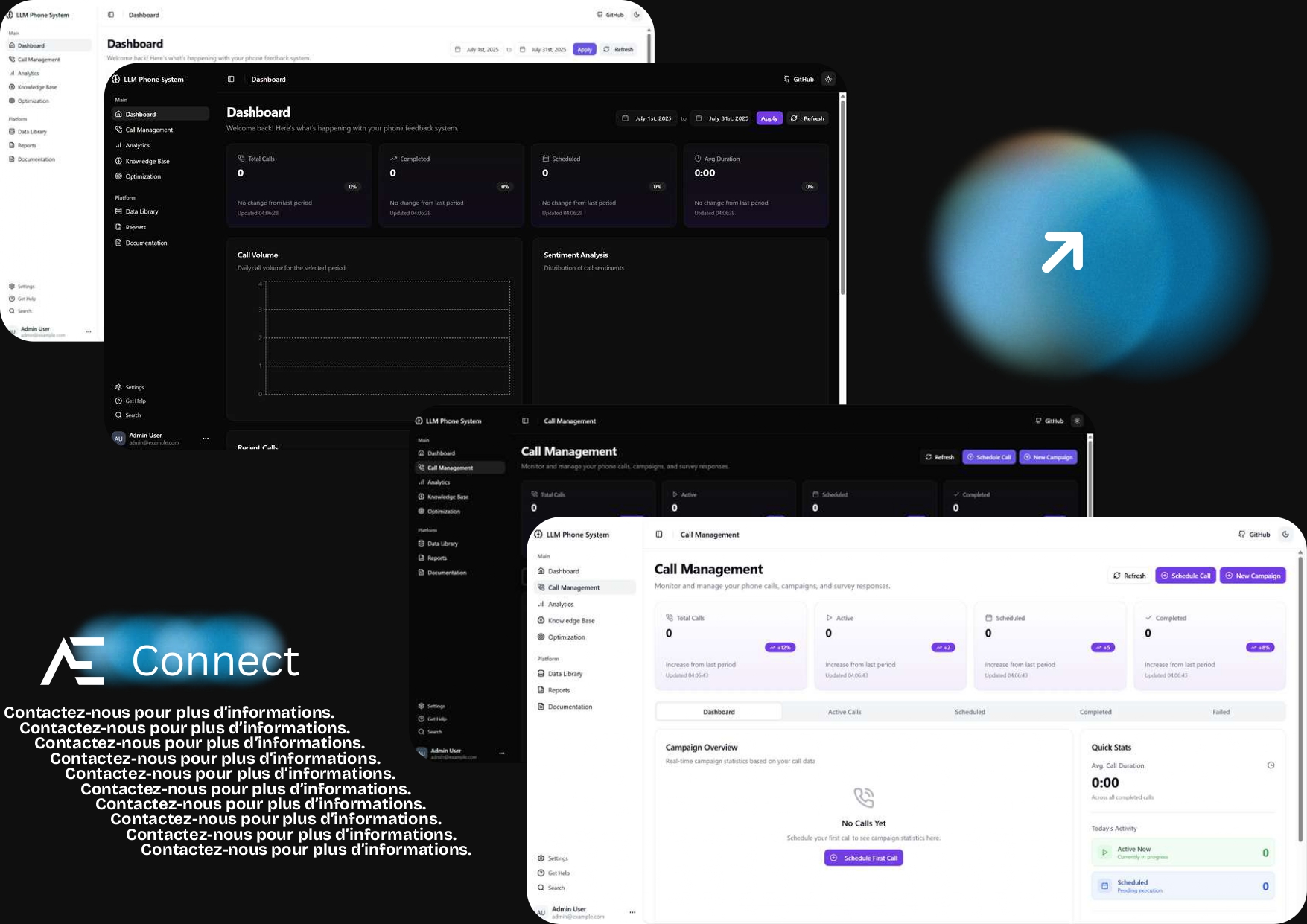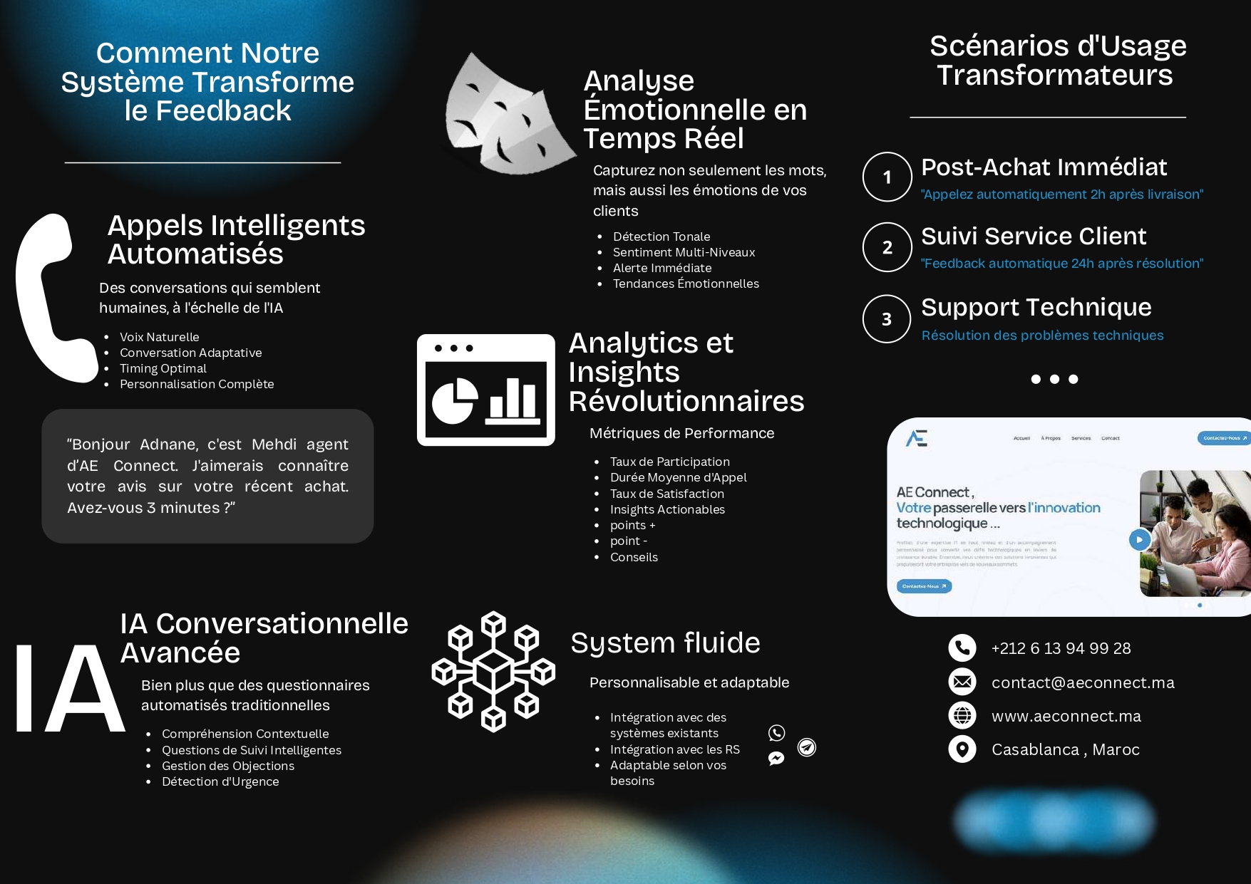 Les appels téléphoniques sont gérés via des webhooks Twilio, permettant une intégration transparente avec l'infrastructure téléphonique. Le système effectue également des analyses de sentiments sur les conversations, fournissant des insights précieux sur la satisfaction client et les retours collectés.