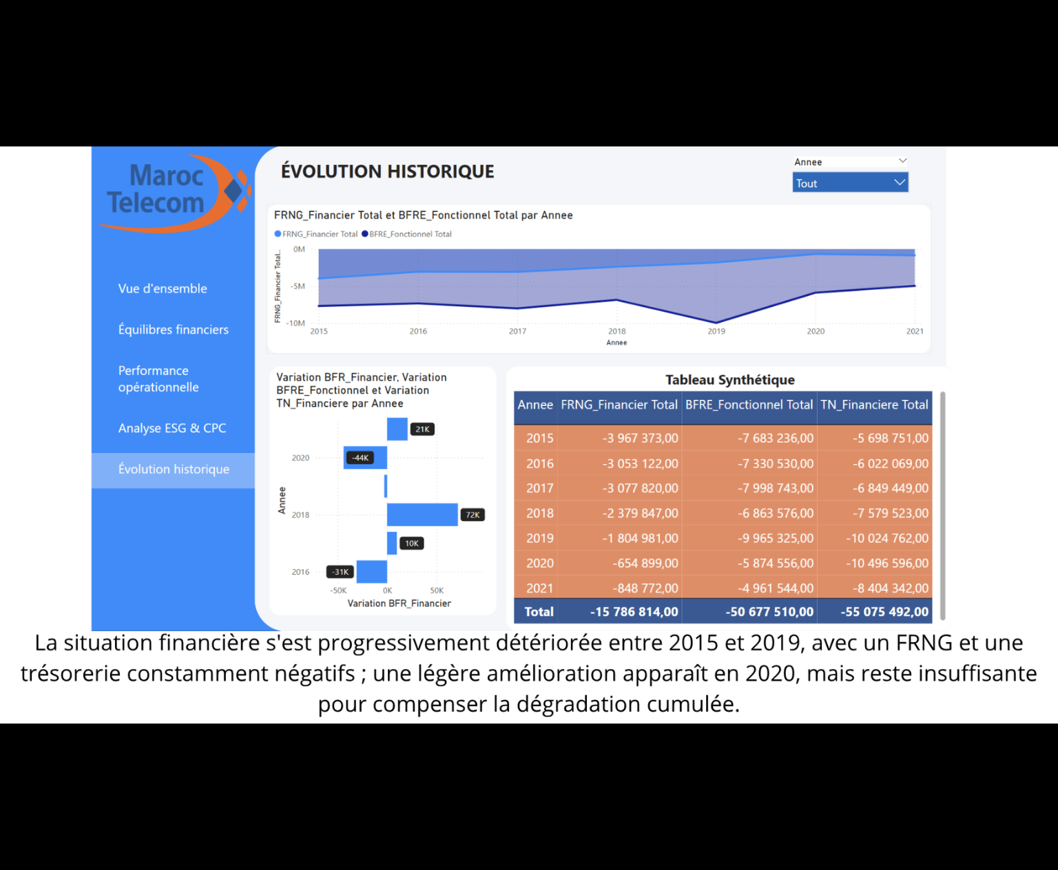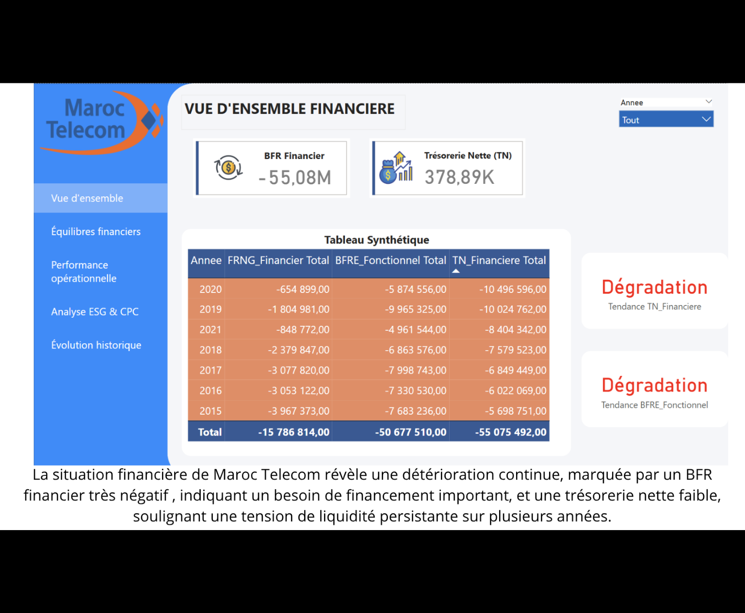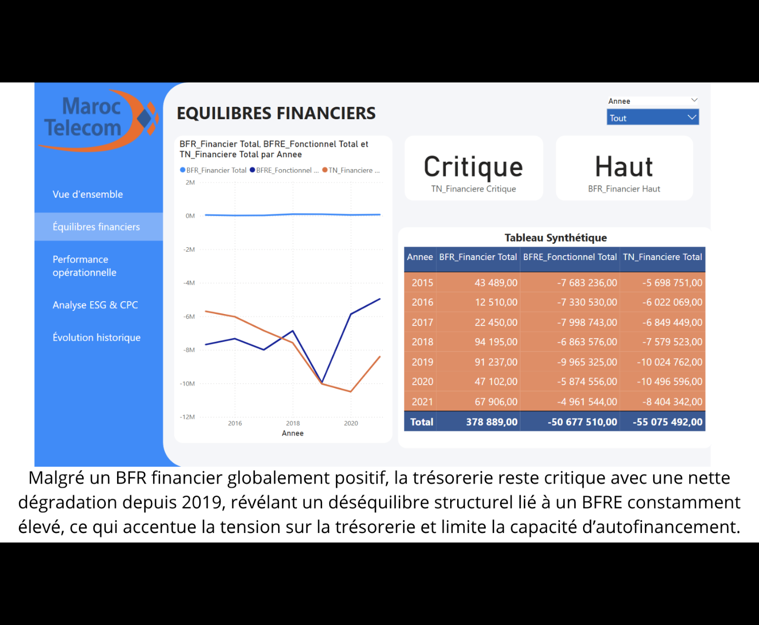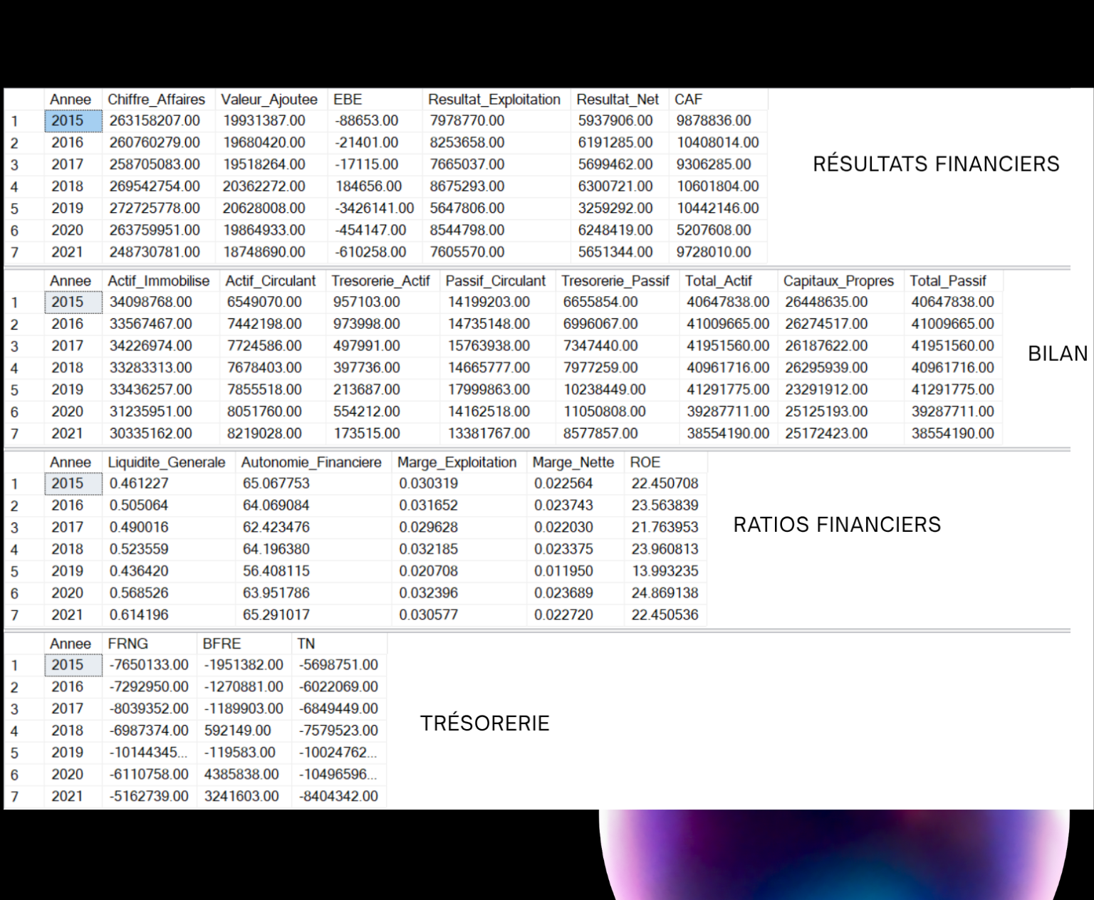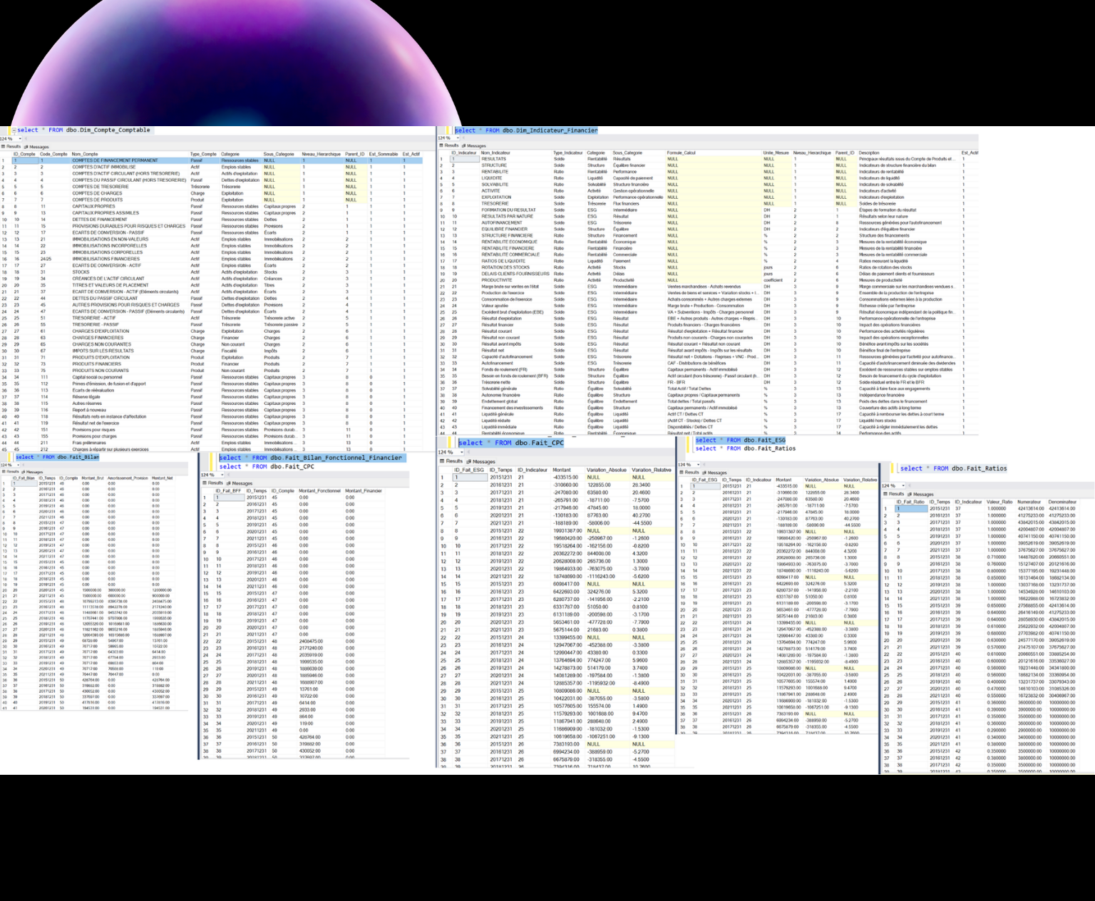 Pour faciliter l'analyse, des vues analytiques ont été créées dans SQL Server, offrant une couche d'abstraction pour les requêtes complexes. Ensuite, des mesures DAX ont été développées dans Power BI pour calculer les ratios financiers et les indicateurs clés de performance. Enfin, des dashboards Power BI interactifs ont été conçus pour visualiser ces analyses et permettre aux utilisateurs d'explorer les données financières de manière intuitive et efficace.