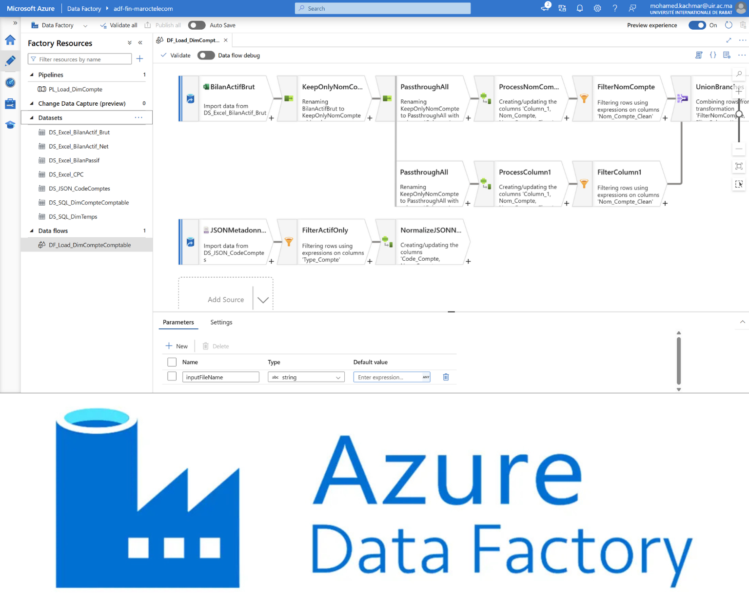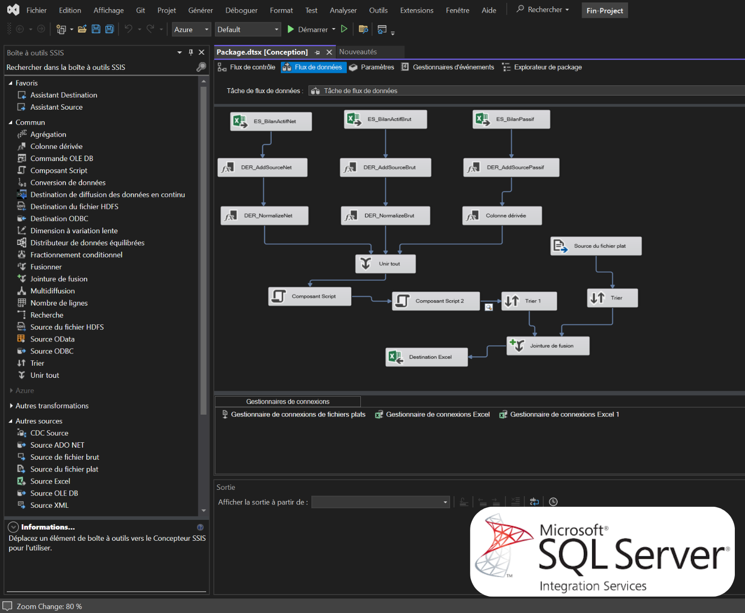 Le pipeline de données a été conçu pour traiter les tableaux financiers provenant de fichiers Excel. Ces données sont ensuite transformées via SSIS (SQL Server Integration Services) et Azure Data Factory, garantissant une intégration fiable et scalable. Les données transformées sont chargées dans SQL Server selon un modèle en constellation, permettant une organisation optimale des données multidimensionnelles.