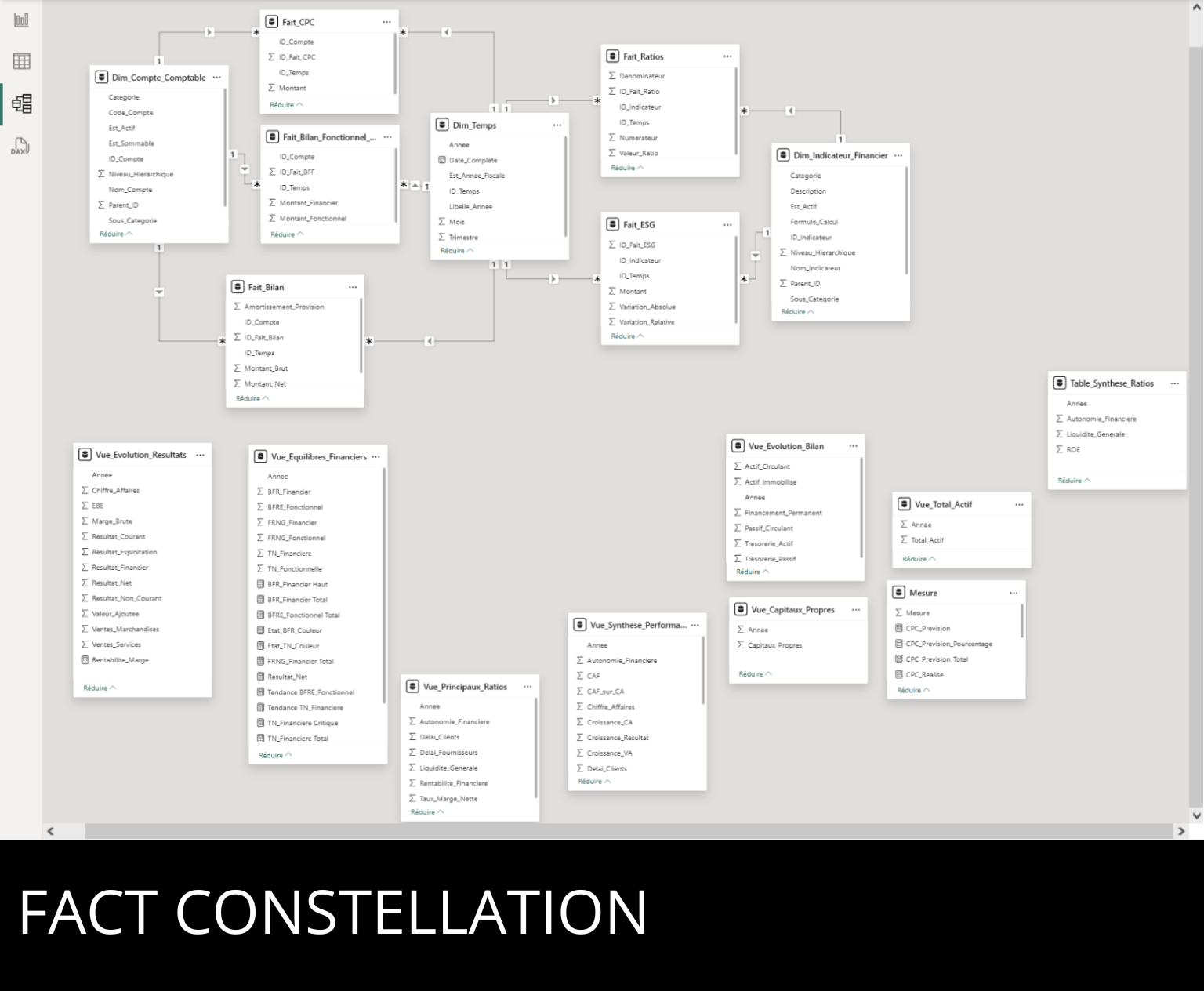 Le projet a débuté par la modélisation selon un modèle en constellation, une approche optimale pour l'analyse des données financières. Cette modélisation permet une structure de données efficace qui facilite les requêtes analytiques et l'agrégation des métriques financières.